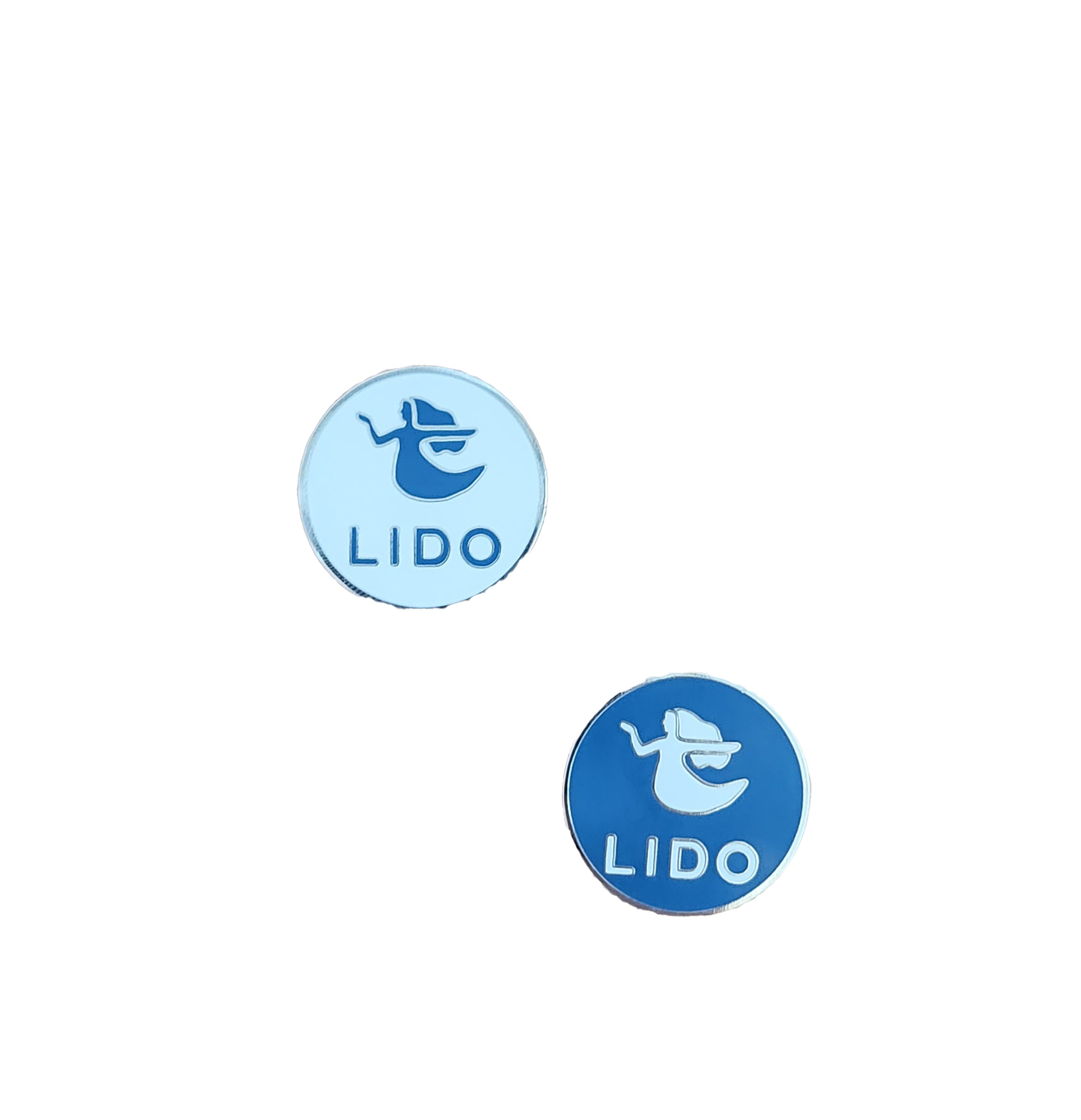 The Lido Ball mark is a double-sided, 25mm enamel mark in a clean white color, similar in size to a nickel.