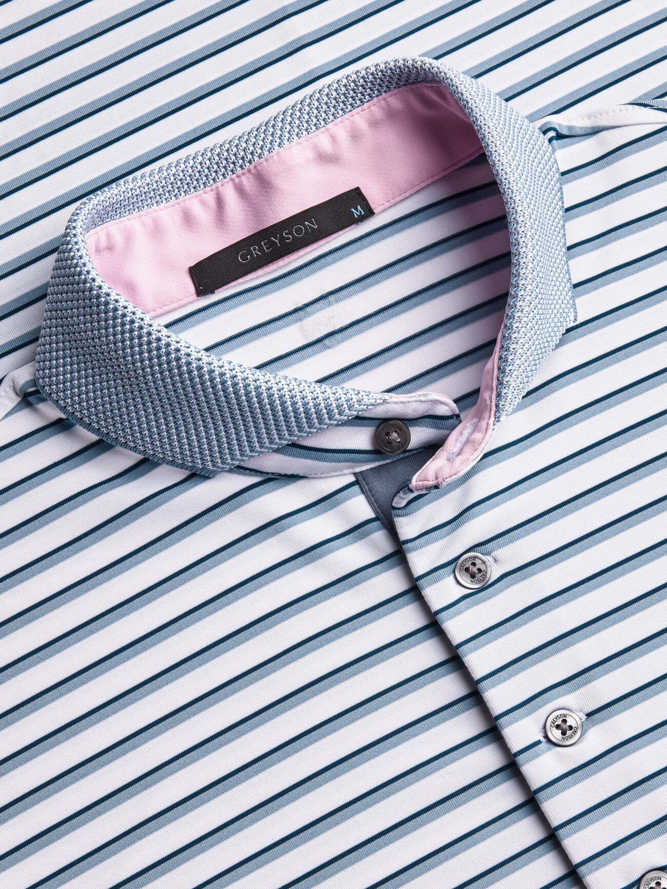 The Pescadero Polo features a timeless striped pattern rendered on breathable, performance fabric that offers natural stretch and quick-drying comfort. Designed to move with you, it balances technical functionality with understated sophistication. This striped performance polo is ideal for warm-weather golf, casual travel, or everyday wear, offering a polished look that doesn’t sacrifice mobility. Finished with a knit jacquard textured cutaway collar, open cuffs, and a four-button placket with contrast detailing.
