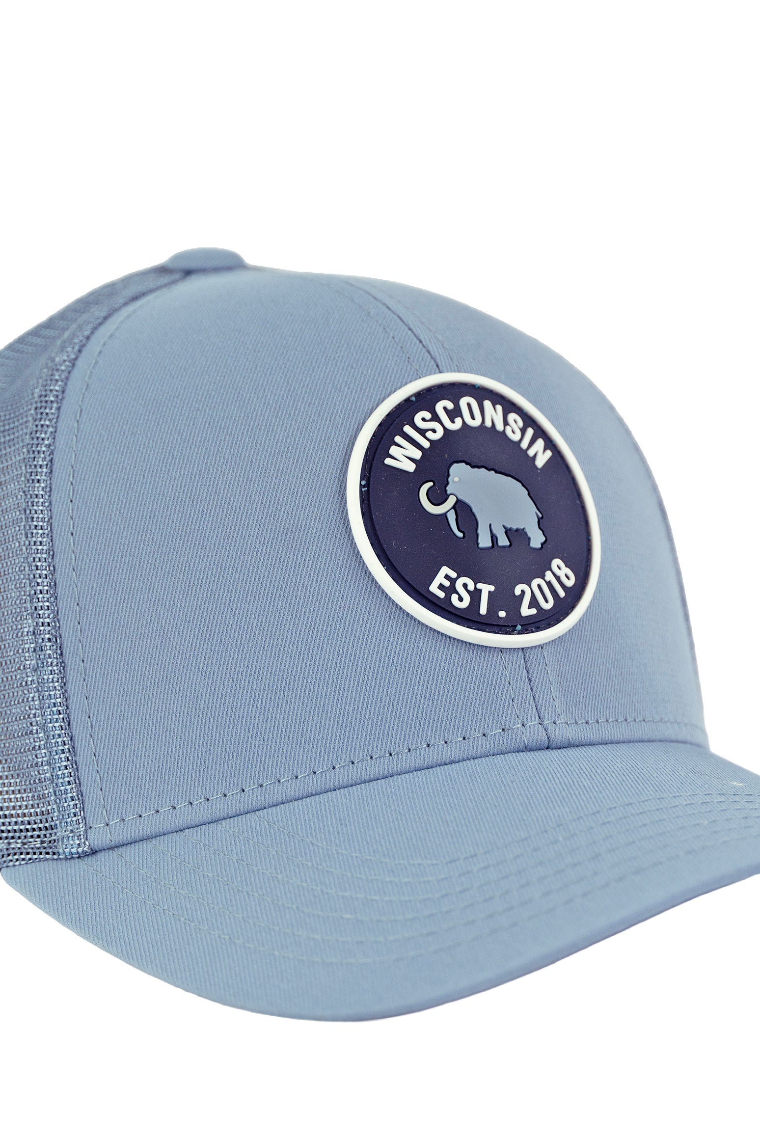 This 6-panel hat features a rubber patch on the front, a mesh back, a Velcro closure, and a mid crown. The front is structured and the color is slate blue with a logo for Mammoth Dunes.