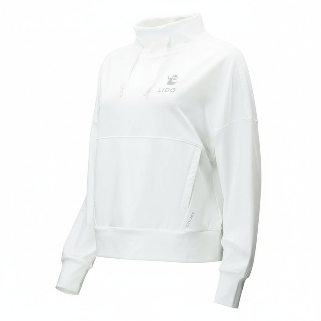 The Zero Restriction Evie Mock Pullover combines effortless style with practical comfort. This white pullover features a relaxed, slightly boxy silhouette that flatters every frame, while the convenient kangaroo pocket keeps your essentials within reach. Perfect for layering or wearing solo, it's the versatile piece your wardrobe has been missing. Designed for those who refuse to compromise between looking polished and feeling comfortable, this pullover transitions seamlessly from casual weekends to active days out.