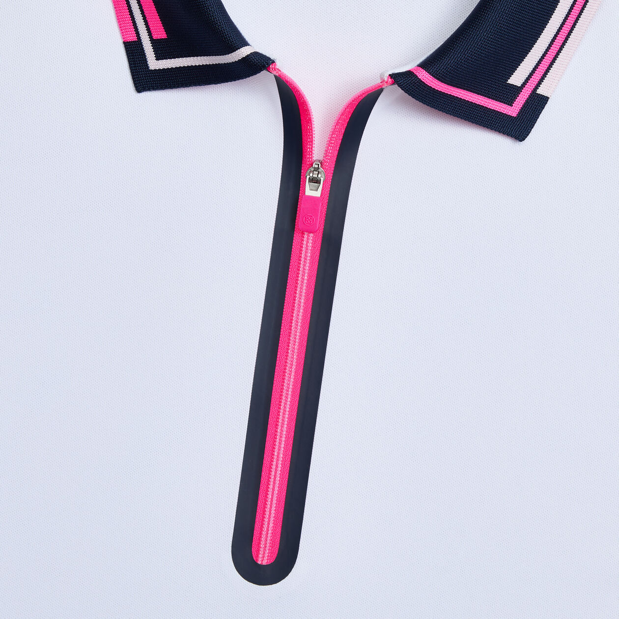 Experience all-day comfort in this quarter-zip tech piqué polo, engineered for active lifestyles. The breathable fabric features moisture-wicking and odor-inhibiting technology to keep you fresh through every swing and serve. Four-way stretch delivers unrestricted mobility, while tailored chest darts ensure a flattering fit. Finished with a contrast stripe collar, branded zipper pull, and silicone G logo detail, a timeless essential that pairs perfectly with your favorite G/FORE skort.
